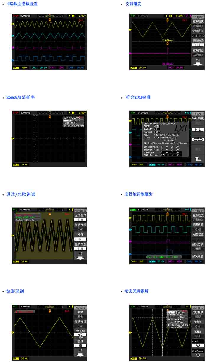 提供4个模拟通道,******200MHz带宽,2 GSa/s实时采样率及50GSa/s等效采样率